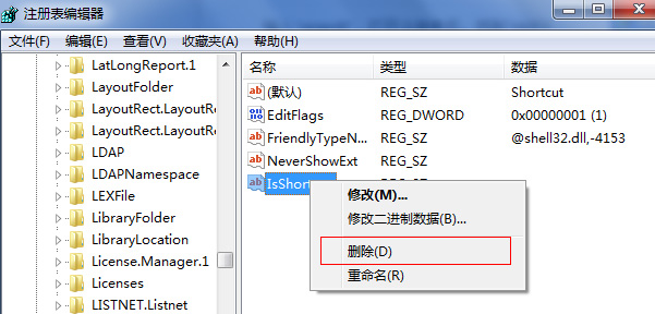 点“开始”-“运行”-输入“regedit”,打开注册表后,找到“HKEY_CLASSES_ROOT”下的“lnkfile”,将右边的“IsShortcut”项删除,然后重启电脑就发现已经消除桌面图标小箭头了。