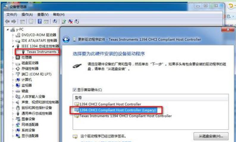 在弹出的窗口中选择浏览计算机以查找驱动程序——从计算机的设备驱动程序列表中选择,最后选择带有Legacy字样的驱动就可以完成更新1394驱动的操作了。