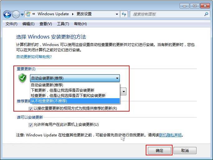 在windows update中点击更改设置,把重要更新选择为从不检查更新即可。
