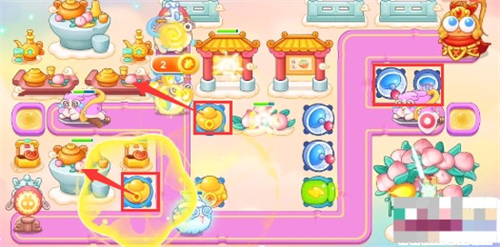 1、本关能够使用的炮塔是:毒针、元宝、鞭炮、雷达、普通炮,我们这一关使用元宝打钱然后雷达清怪。。
