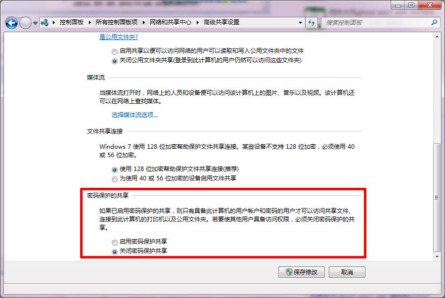 然后在高级共享设置中找到密码保护的共享,更改为关闭密码保护共享即可实现局域网共享不需要输入用户名和密码了。