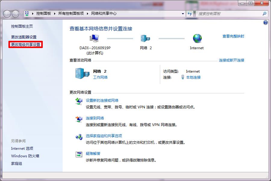 首先打开控制面板,点击网络和共享中心,在网络和共享中心打开更改高级共享设置。
