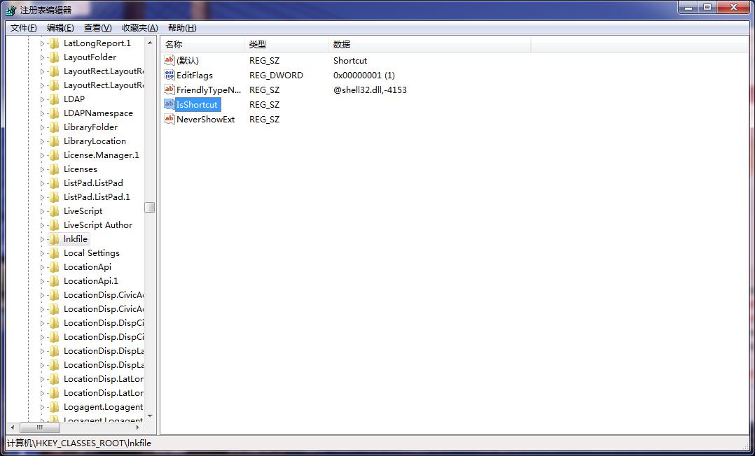接着点击目录HKEY_CLASSES_ROOT\lnkfile,删除右侧列表中的IsShortcut值。