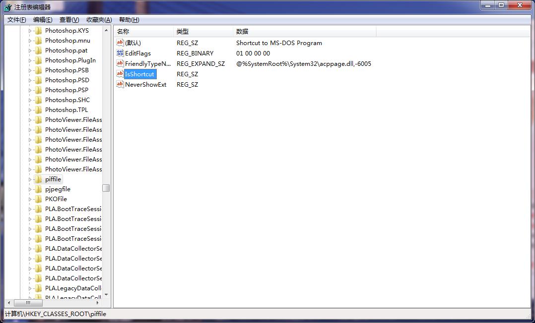 然后转到HKEY_CLASSES_ROOT\piffile目录,删除右侧IsShortcut值即可。