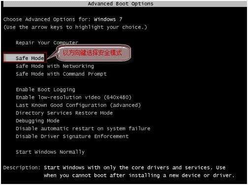 启动计算机时,在系统进入 Windows 启动画面前,按下 F8 键;出现操作系统多模式启动菜单后,用键盘上的方向键选择“SafeMode”,以安全模式启动计算机。