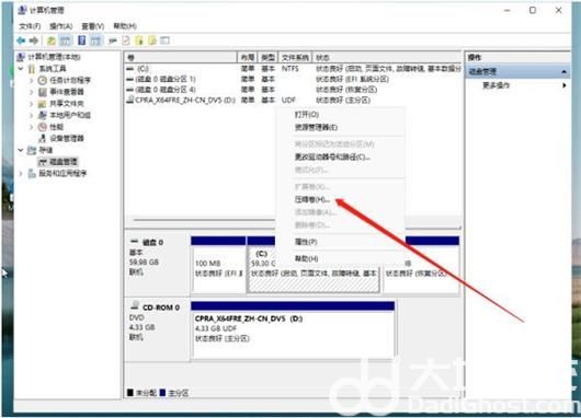 3、然后用鼠标右键选择要分区的磁盘c盘,选择压缩卷打开。