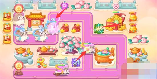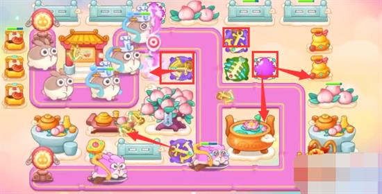 3、鱼刺开右侧的大道具,之后开蟠桃树附近的钱袋,之后将所有炮塔升满级。