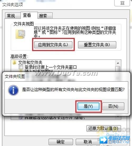 第三步:单击“查看”按钮,切换到“查看”选项卡,单击“文件夹视图”下的“应用到文件夹”按钮,弹出的“是否让这种类型的所有文件夹与此文件夹的视图设置匹配?”提示框,单击“是”按钮(如图3),即可同步所有文件夹的视图。