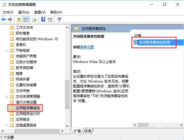 在本地组策略编辑器中依次点击用户配置——管理模板——Windows组件——应用程序兼容性,双击打开关闭程序兼容性助理的选项。