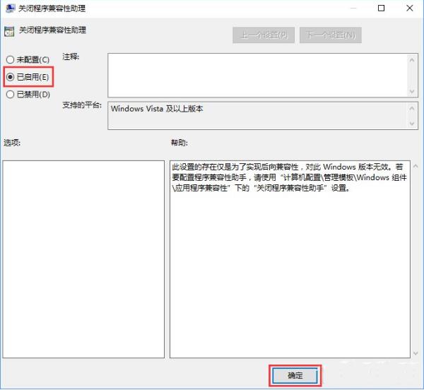 把这个策略设置为已启用就可以关闭程序兼容助手服务了。