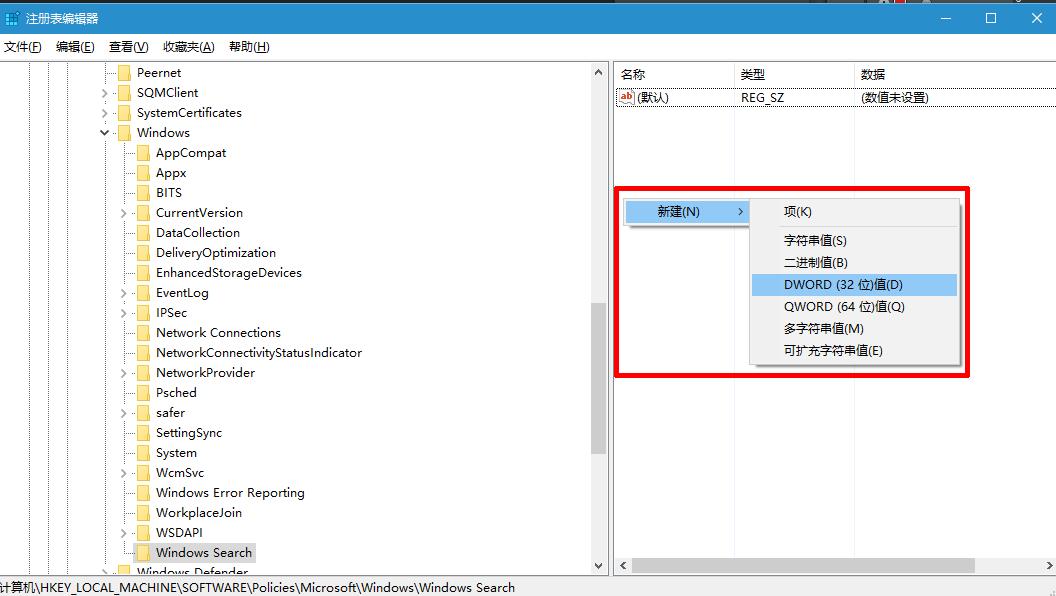 3.在“Windows”目录新建一个名为“Windows Search”的项。