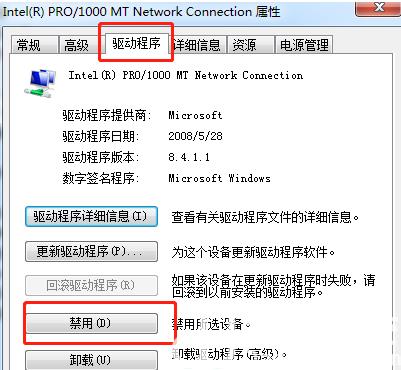 2、点击驱动程序,点击禁用,然后等一小会,重新启用网卡驱动试试。