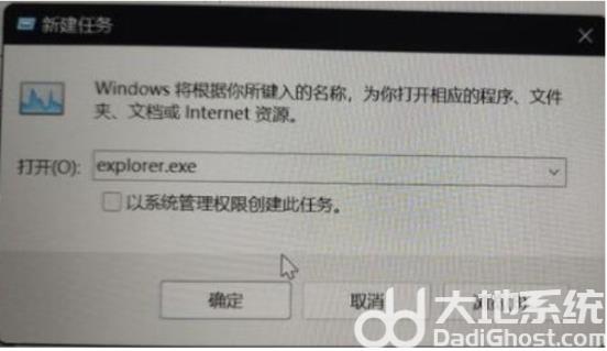 4.在新建任务中输入“explorer.exe”勾选下方管理权限,再点击“确定”即可修复升级win11后黑屏不出现桌面的问题。