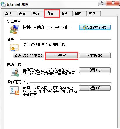 首先打开ie浏览器,点击菜单栏中的internet选项,切换到内容标签,点击证书。