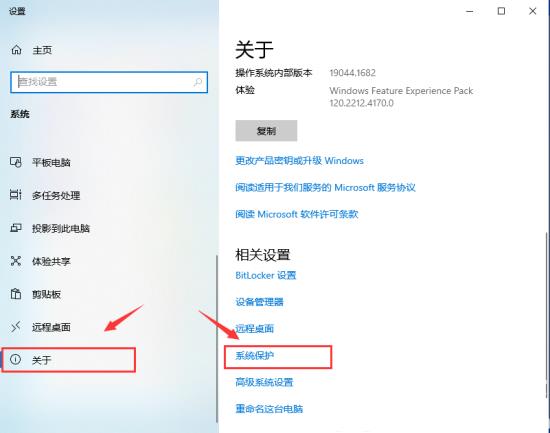 3、选择下面的系统,点击进入,找到关于,选择系统保护。