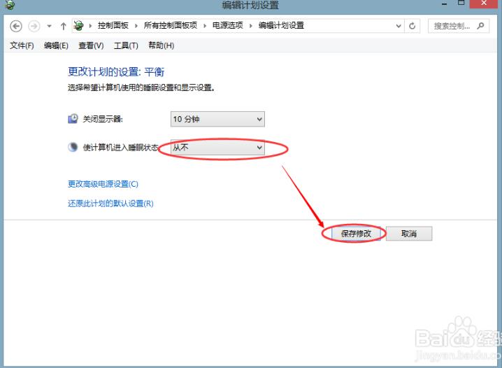 在更改电源设置中继续点击更改计划设置,把使计算机进入睡眠状态设置成从不就可以关闭电脑自动休眠功能了。