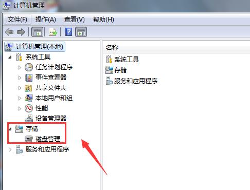 在计算机管理窗口中点击存储中的磁盘管理。
