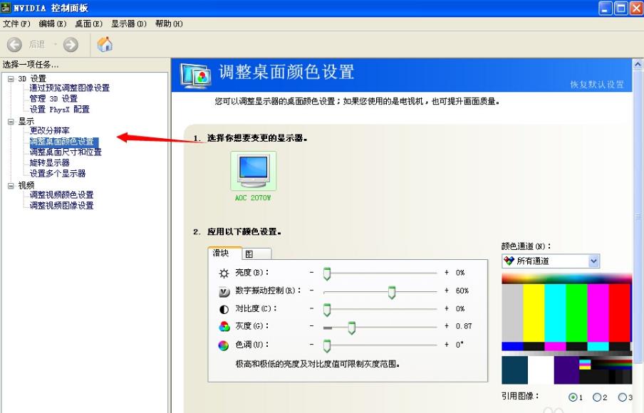 在nvidia控制面板中点击调整桌面颜色设置,接着就可以调节电脑屏幕亮度了。