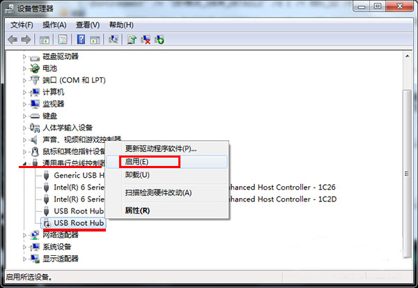 展开通用串行总线控制器,找到出现问题的usb驱动,右键点击启用。