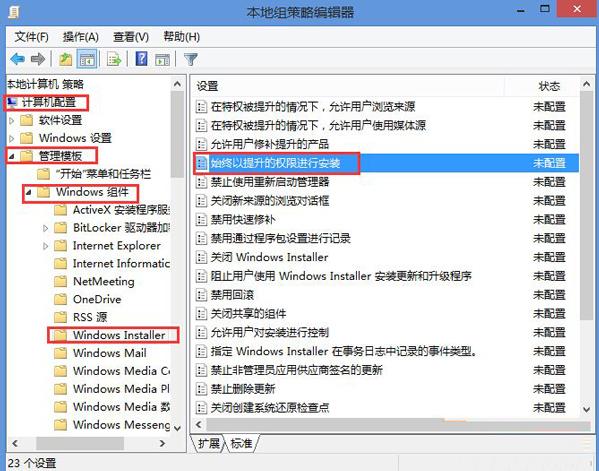 在组策略编辑器中依次点击计算机配置——管理模版——windows组件——windows installer,找到始终以提升的权限进行安装。