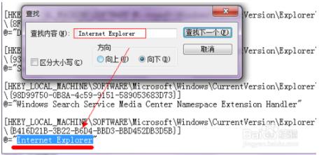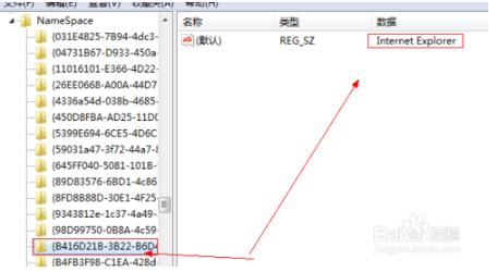 把NameSpace这个项导出到桌面上,并以记事本的方式打开NameSpace,在查找中输入Internet Explorer找到相应的项目,此时注意一下编号是{B416D21B-3B22-B6D4-BBD3-BBD452DB3D5B}。
