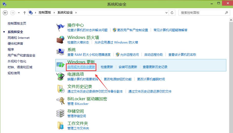 第三步:在系统和安全界面点击“Windows更新”下的“启用或关闭自动更新”,如下图所示。
