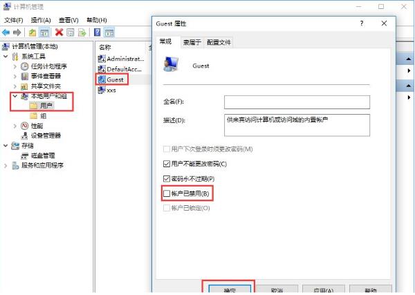 在计算机管理窗口中我们点击本地用户和组——用户,双击打开guest,把账户已禁用的勾去掉就可以解决问题了。