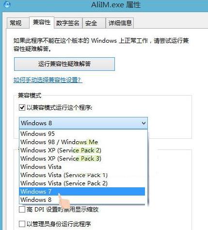 在属性窗口中点击兼容性标签,勾选以兼容模式运行这个程序,选择windows7,点击确定,再次运行程序就不会出现异常代码C0000005了。