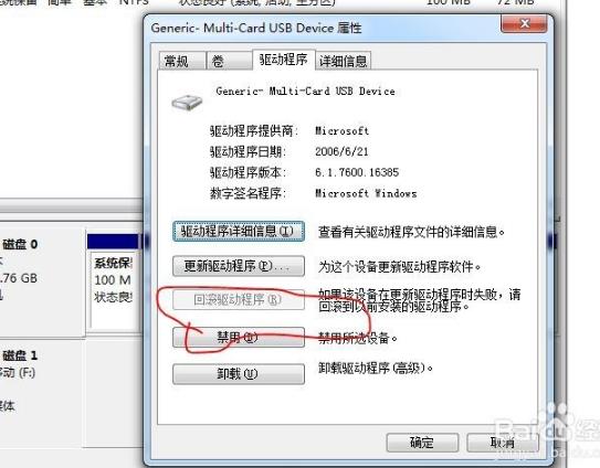 然后右键打开这个磁盘的属性窗口,点击驱动程序中的禁用,这样就可以解决win7系统总是弹出驱动器中没有磁盘的问题了。