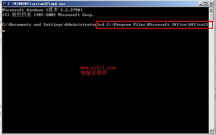2、在打开的命令提示符窗口中,输入“cd C:\Program Files\Microsoft Office\Office12”然后确定,不带“”号。如下图1-2所示。