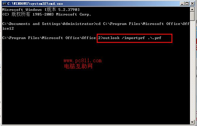 3、然后再输入“outlook /importprf .\.prf”,不带“”号,然后确定。