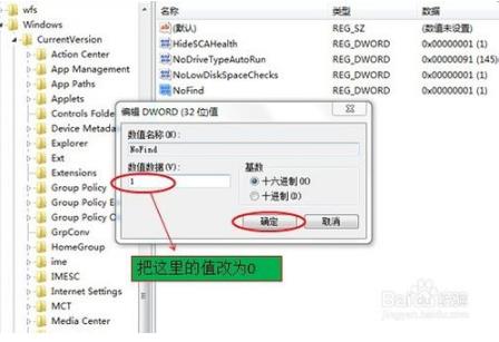 找到NoFind的值,双击打开,设置数值数据为0,这样就可以解决电脑搜索功能不能用的故障了。
