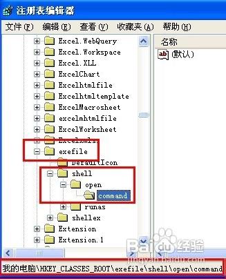 四、然后再定位到目录HKEY_CLASSES_ROOT\exefile\shell\open\command。