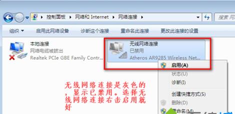 如果无线网络连接的按钮是灰色的,可以右键点击,选择启用。
