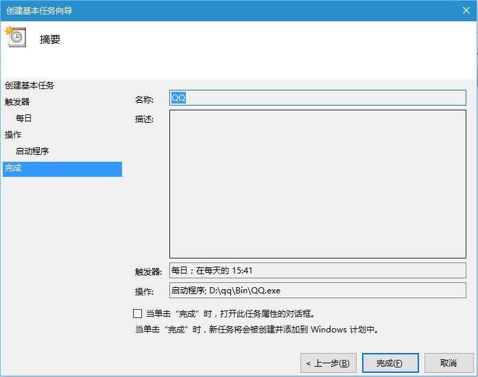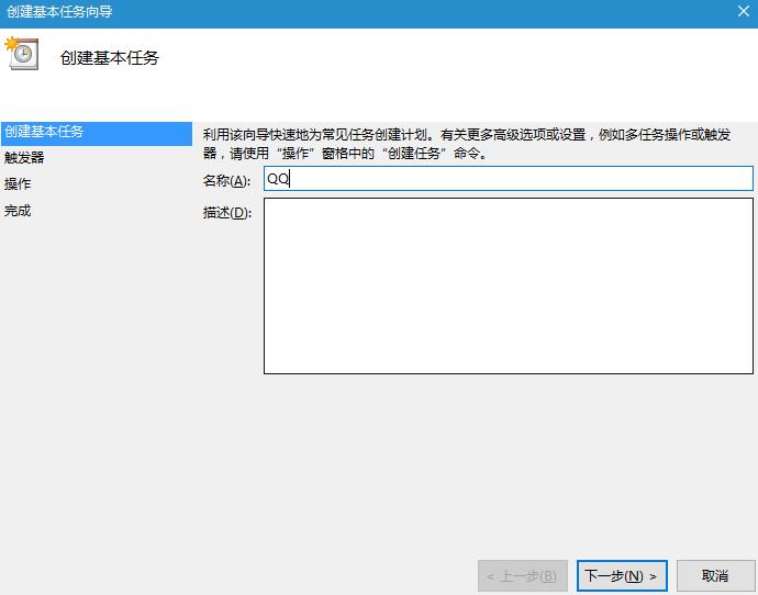 然后点击创建基本任务,输入启动项目的名称(比如QQ),然后下一步设置启动时间,然后选择文件的启动路径保存即可。