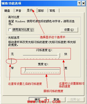 打开辅助功能选项后(如下图2所示)>选择显示>然后下面有个闪烁速度>可以用鼠标拉着向左就是越来越慢,向右就是越来越快。再下面就是鼠标光标的宽度一样的设置方法。然后确定之后就生效。