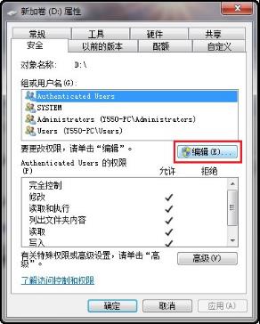 在该文件夹的所属磁盘中右键打开属性,转到安全标签,点击Authenticated Users点击编辑,将写入权限设置为允许即可。