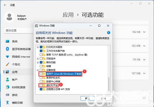 依次点击【开始图标 > 设置( Win + i ) > 应用 > 可选功能 > 更多 Windows 功能】。Windows 功能窗口,找到并取消勾选【Hyper-V、适用于 Linux 的 Windows 子系统、虚拟机平台】。