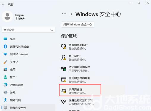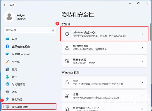 设置窗口,左侧边栏,点击【隐私和安全性】,右侧点击安全性下的【Windows 安全中心(适用于你的设备的防病毒、浏览器、防火墙和网络保护)】;