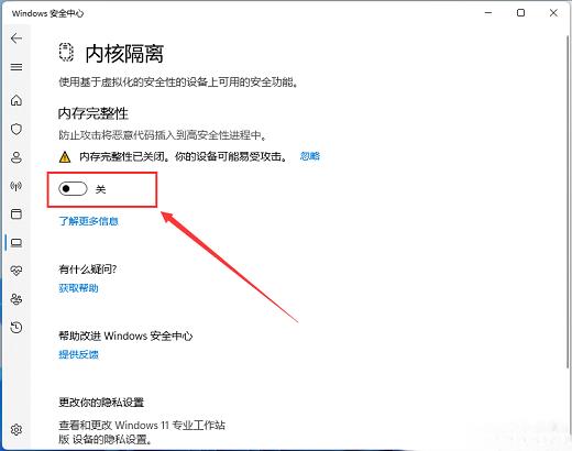内核隔离下,滑动滑块,就可以将内存完整性关闭。
