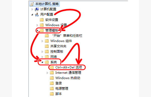 二、接着在"本地组策略编辑器"中的左侧列表中,按照下面的顺序依次打开"用户配置——管理模板——系统——Ctrl+Alt+Del选项"。