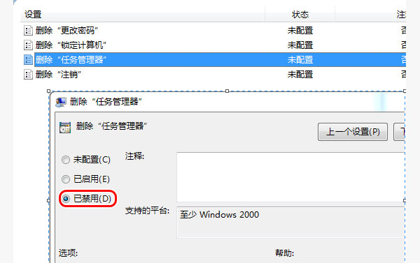 三、下面,在右侧列表中我们可以看到"删除"任务管理器""这个项目,我们双击它,将其设置为"已禁用"这样就可以正常使用任务管理器了。