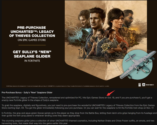 《神秘海域:盗贼传奇合集》已为 PC 平台全面重制优化,将于 10 月 19 日登陆Epic游戏商城,如果你预购本作品,便可获得一款酷炫的基于 Sully 的海上飞机模样的全新《堡垒之夜》滑翔伞。