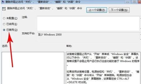 找到“删除并组织访问“关机”、“重新启动”、“睡眠”和“休眠”命令”,双击打开设置为已禁用即可。