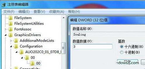 在运行窗口中输入regedit进入注册表编辑器,依次打开进入HKEY_LOCAL_MACHINE/SYSTEM/ControlSet001/Control /GraphicsDrivers/Configuration,双击右边窗口的“Scaling”名称,将数值数据由4改为3 即可。