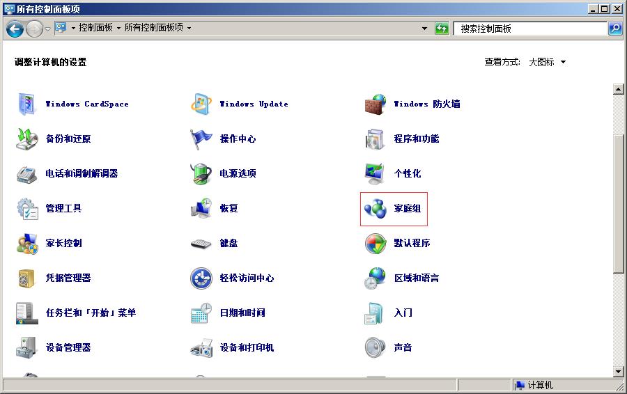 首先打开控制面板,切换到大图标显示,点击家庭组。