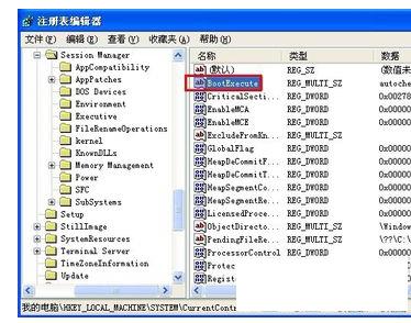 在右边列表中寻找BootExecute,双击鼠标开启。