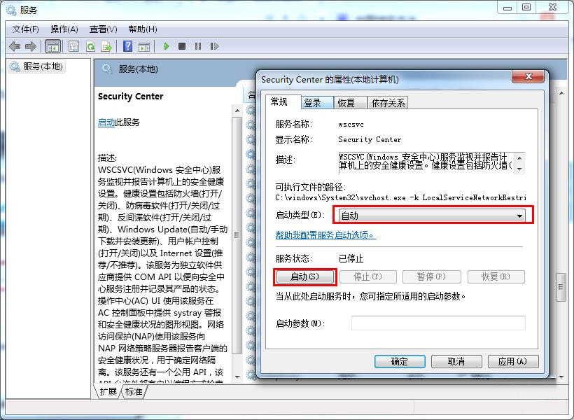 在服务窗口我们找到名为security center的服务,双击打开,设置启动类型为自动,点击启动按钮即可解决电脑公司win7安全中心打不开的故障
