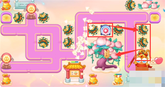 4、在后方放置雷达把后方的道具全清放置多重箭之后就锁定桃树即可。