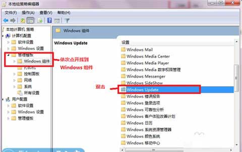 在本地组策略编辑器中点击管理模版——windows组建——windows update。